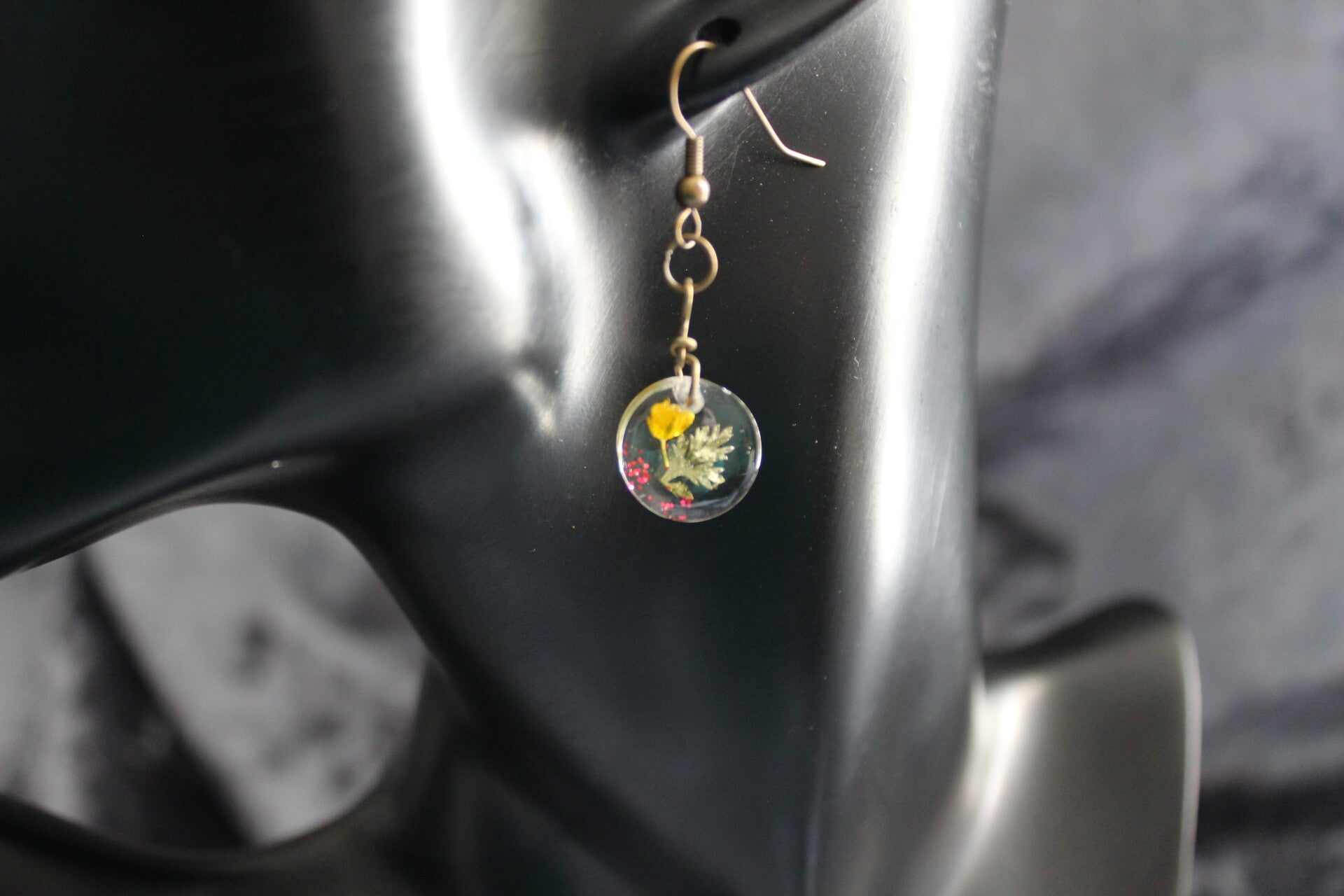 Handmade earring made from resin with equisite flowers encased in the resin. Steel hooks and fixings.